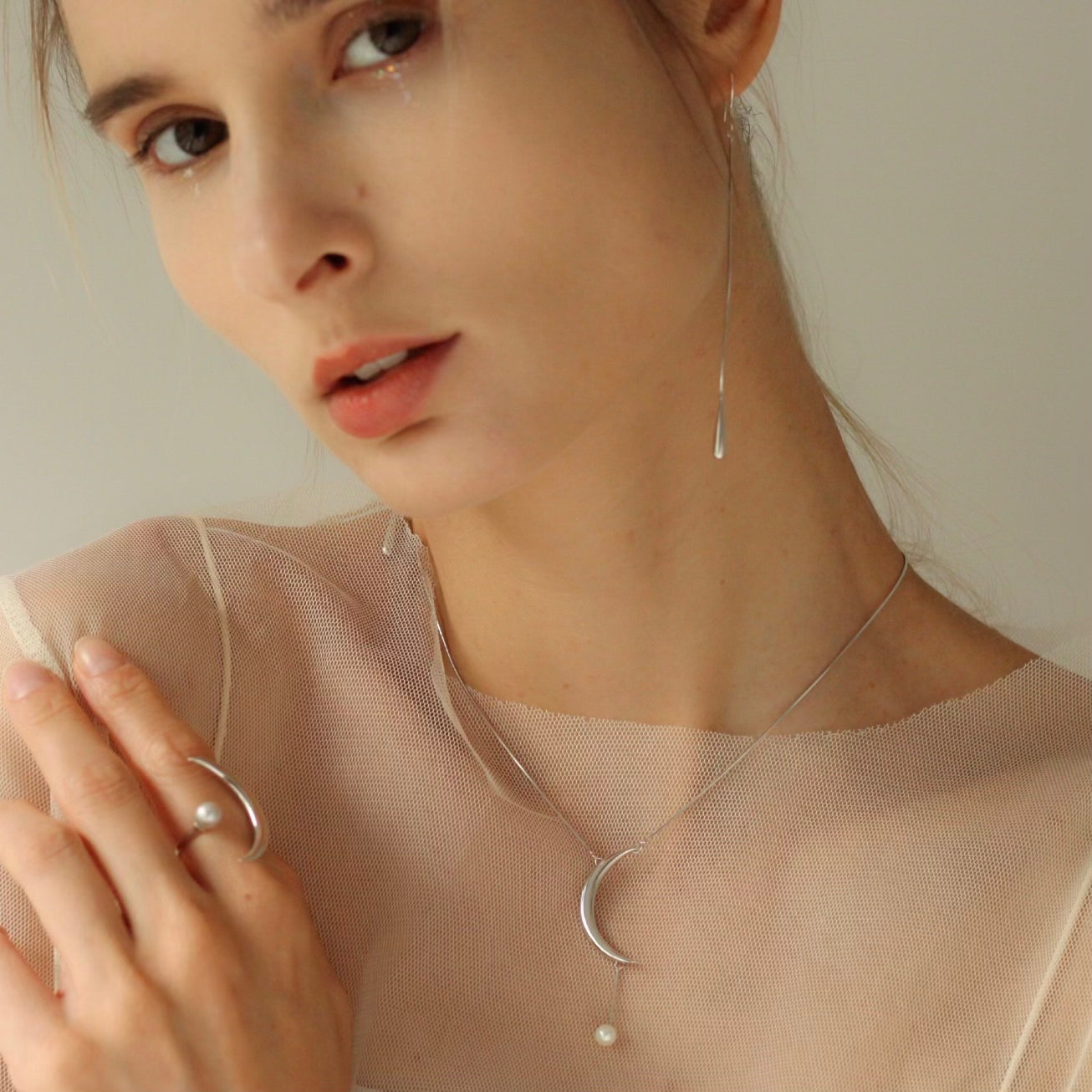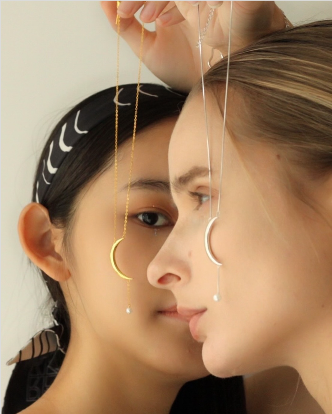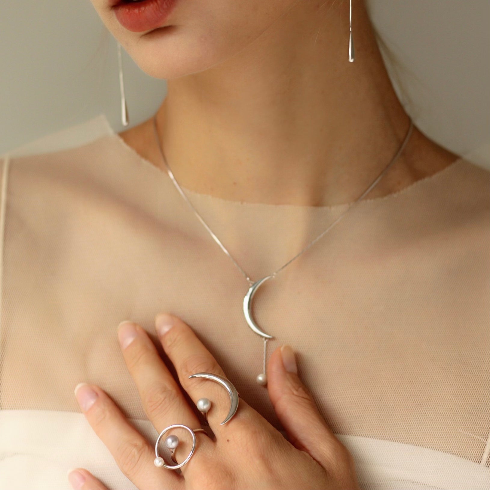 極簡洗鍊的月亮造形與如星光般點綴其中的珍珠對望,並以簡約洗鍊的蛇鍊連結,是一款為頸間賦予詩意的項鍊。