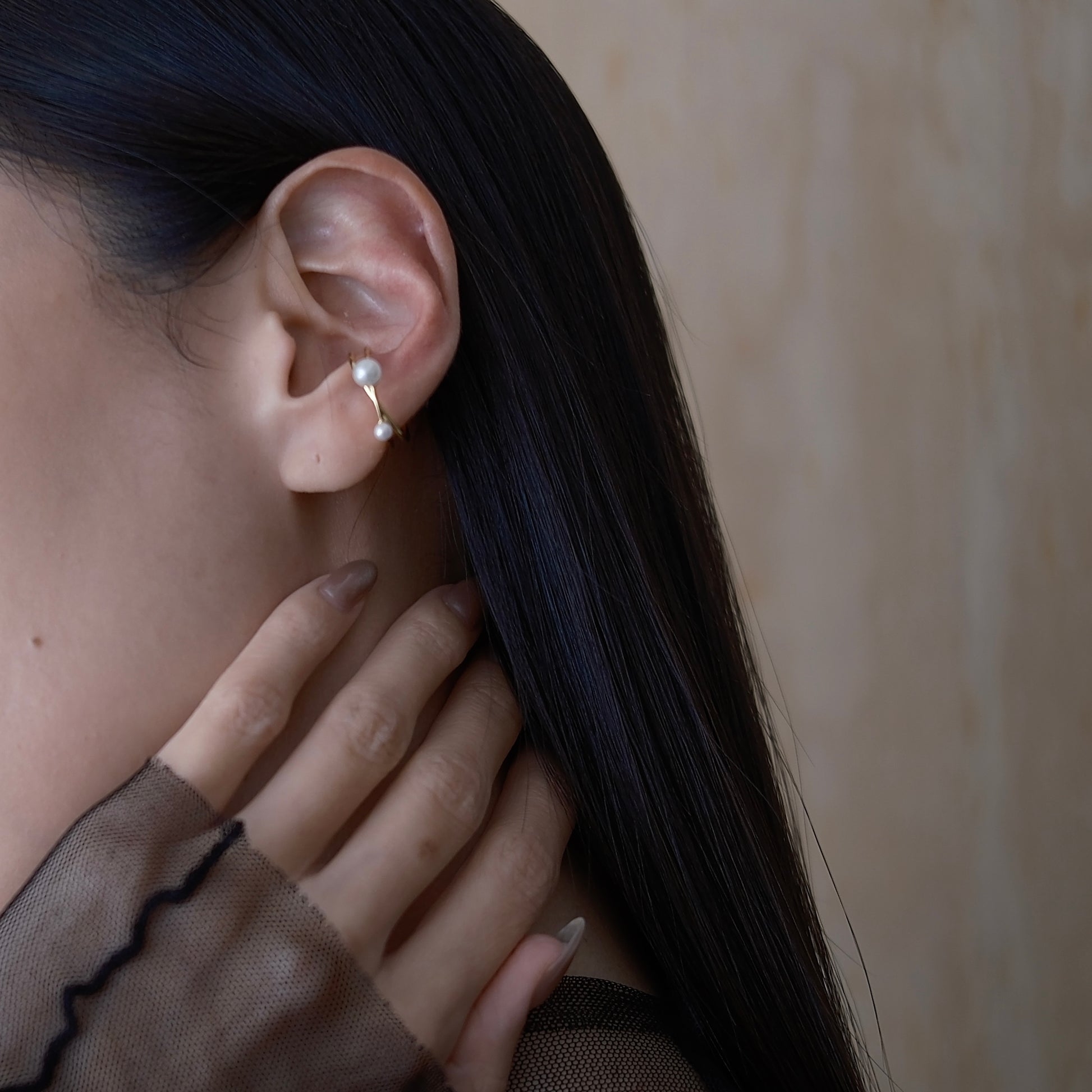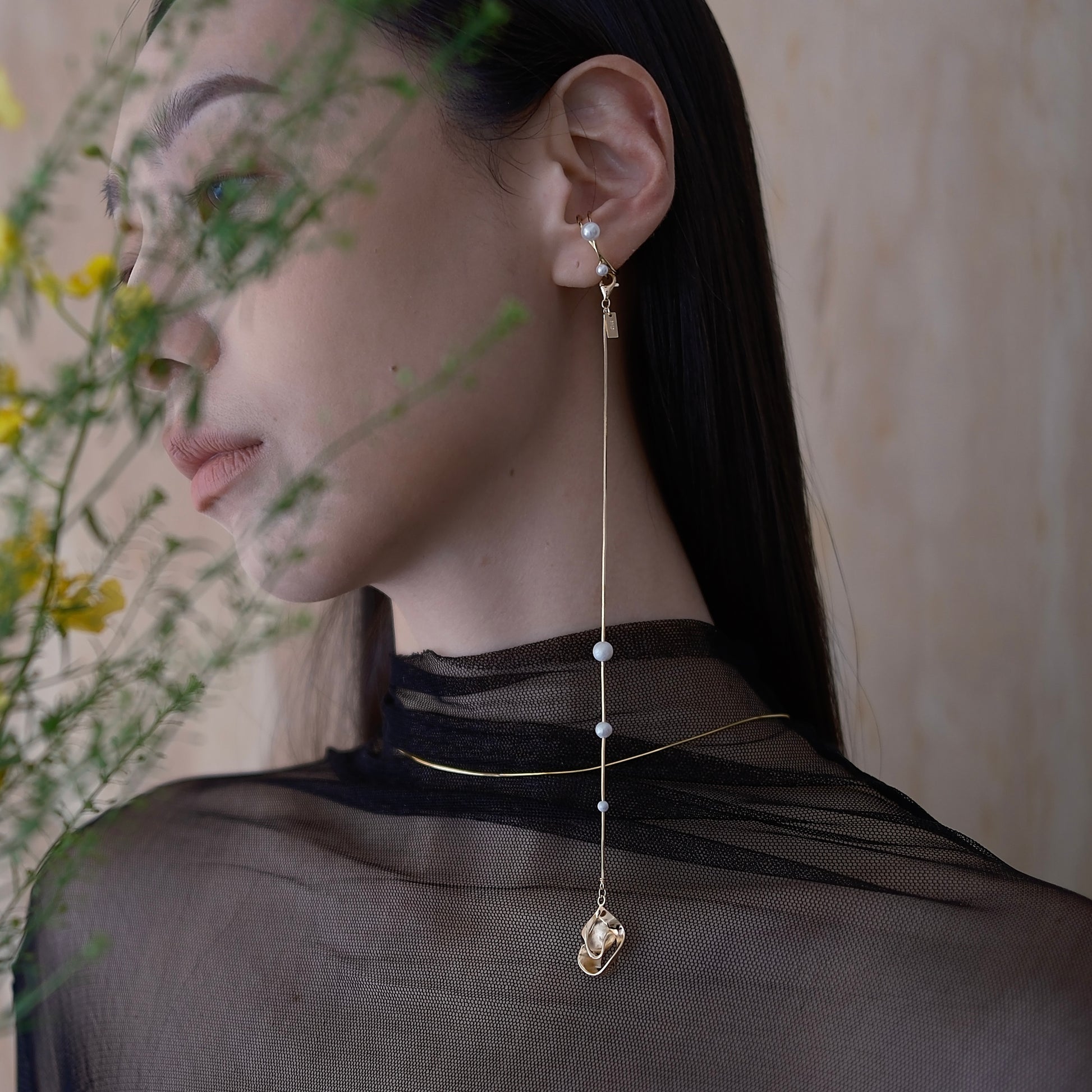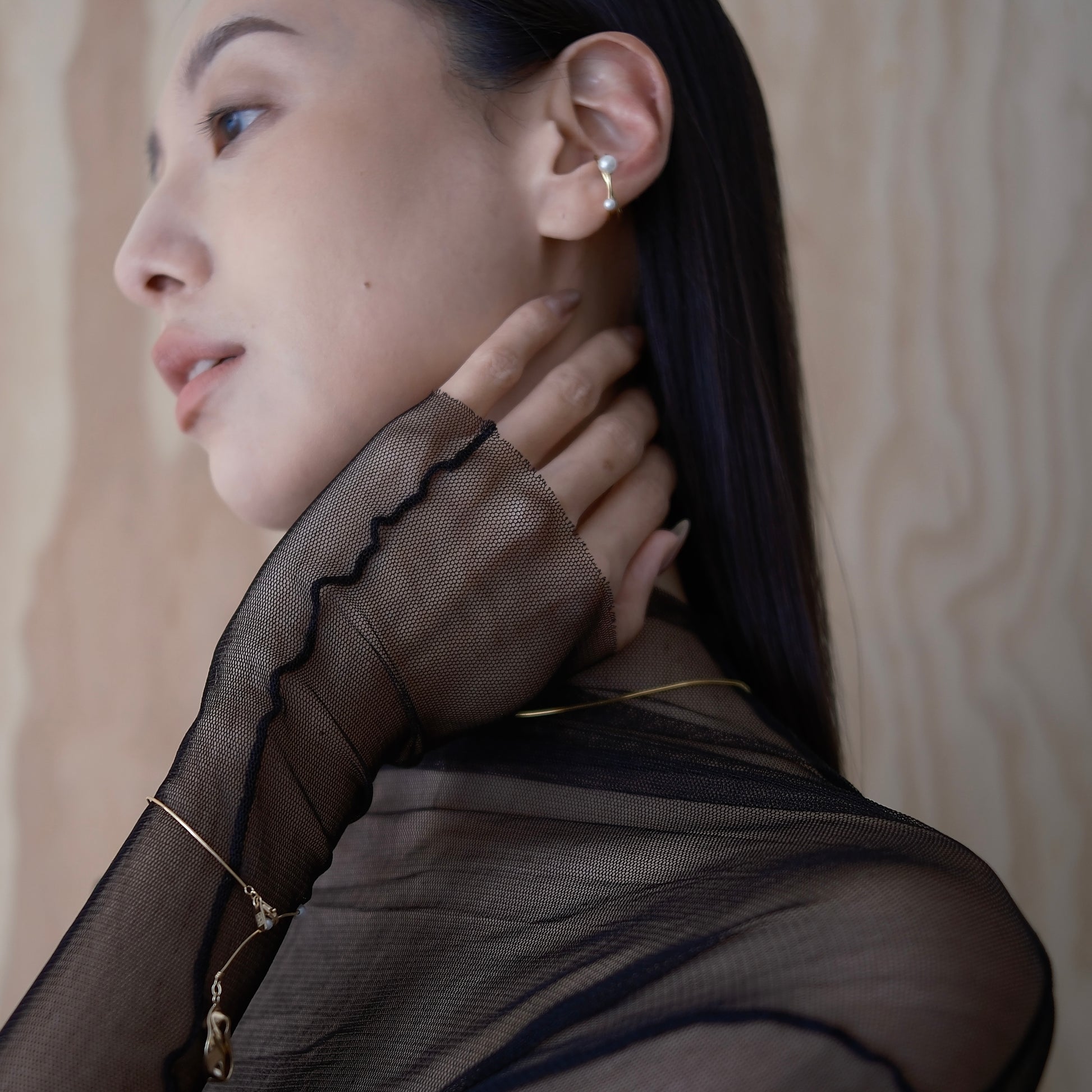 時空漣漪效應意味宇宙中的時空是在引力作用下,發生拉伸現象,這才出現了不同維度的時空所在。設計師以不規則的蟲洞為造形, 耳骨鍊的珍珠如受引力般墜落為意象,造就此款別緻的耳骨鍊。